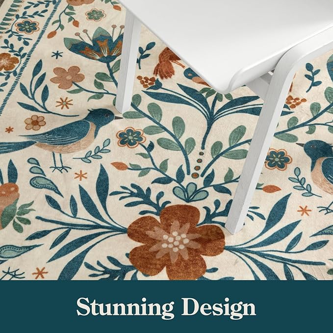 - [Bright and Elegant Design]: Featuring a beautiful bird and flower pattern with bright, vivid colors, our Moynesa rug adds a touch of elegance and charm to any room, effortlessly complementing a variety of décor styles