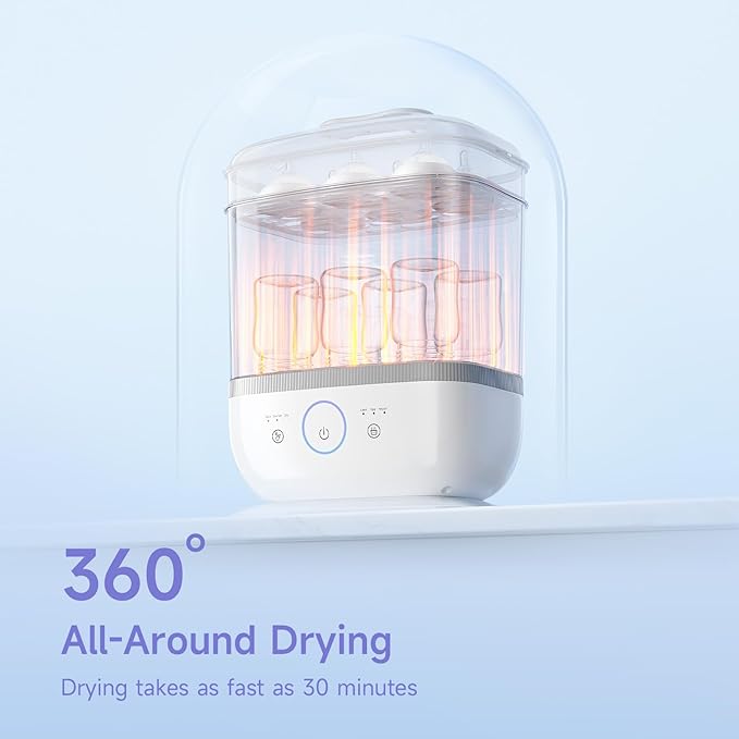 - 360° All-Around Drying & Hygienic Steam: This baby bottle sterilizer and warmer uses 360° high-temperature natural steam to deeply clean bottles and accessories. It ensures thorough drying with all-around airflow. After the cleaning process, items can be kept in a clean and sealed environment for up to 72 hours