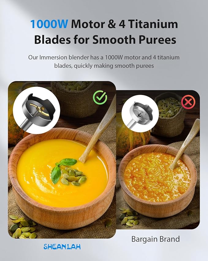 - 【4-Blade Titanium Head】Our immersion blender features a 4-blade titanium head for superior performance. Compared to standard 2-blade designs, it blends more efficiently, This cutting-edge design not only improves blending efficiency but also extends the lifespan of the blades, making it a reliable choice for all your culinary needs.