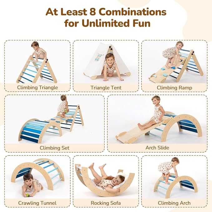 - 8-in-1 Montessori Indoor Climbing Set: Comes with pikler triangle, half-round climber, double-sided slide, cushion, and tent cloth. The pikler triangle set offers at least 8 experiences with climbing, sliding, rocking, and tent-building while promoting toddlers' motor skills, balance, coordination, exploration, independence, etc. Safe, versatile, and perfect for toddlers aged 18 months - 6 years