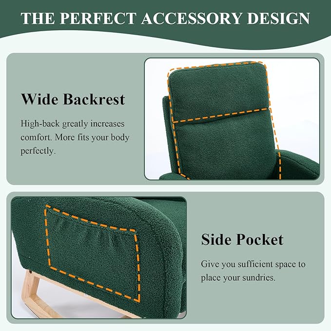 - Humanized Design - Tailored for comfort, there is a large pocket on the side of the armrest, which is convenient for you to put magazines or TV controllers. Our nursery rocking chair comes with an improved adjustable footrest. The adjustable design allows you to find the perfect angle for nursing or reading, offering excellent back support. The smooth rocking motion soothes babies to sleep, creating precious moments of rest for parents.