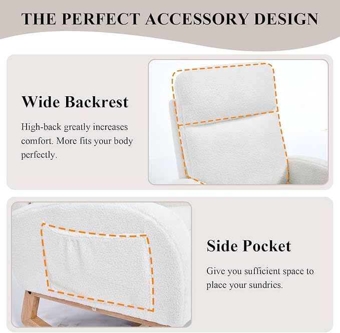 - Humanized Design - Tailored for comfort, there is a large pocket on the side of the armrest, which is convenient for you to put magazines or TV controllers. Our nursery rocking chair comes with an improved adjustable footrest. The adjustable design allows you to find the perfect angle for nursing or reading, offering excellent back support. The smooth rocking motion soothes babies to sleep, creating precious moments of rest for parents.
