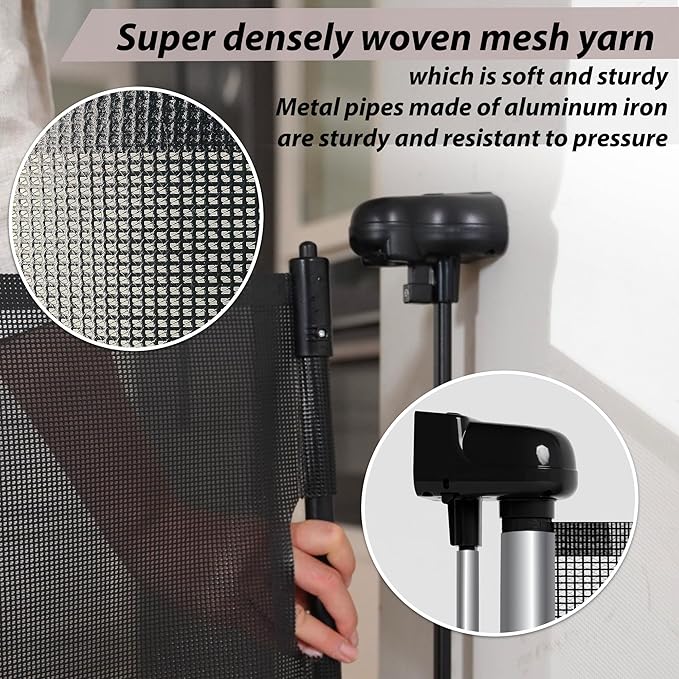 - Suitable for Indoor and Outdoor Use - Our PVC retractable fence mesh is easy to clean, even after outdoor use. Simply wipe it down with a damp cloth or rinse it with water. Ideal for installation at the top or bottom of stairs, in kitchens, near doors, on terraces, in corridors, gardens, and more—suitable for both indoor and outdoor use.