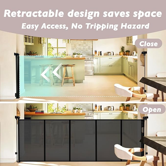 - 41" Heightened and Safer - Our retractable dog gate stands at 41 inches, significantly taller than the traditional 34 inches. It effectively prevents children and pets from climbing over, thereby reducing the risk of falls down the stairs. It’s the perfect solution for ensuring safety at doors and stairs.