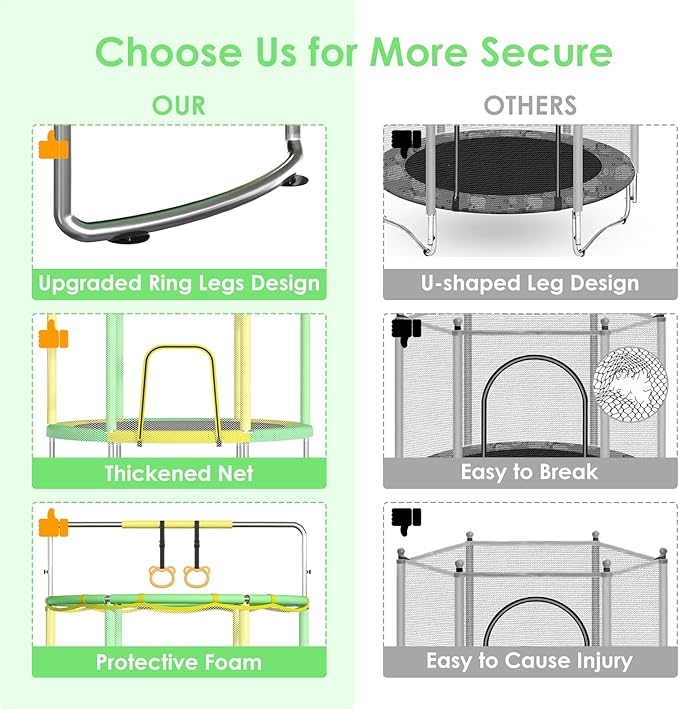 - 【Safety Upgraded】This 55" toddler trampoline features an upgraded ring legs design for added stability and safety. It comes with a 360° wrap-around, environmentally friendly three-layer thickened safety pad, a reinforced safety net, and upgraded foam for enhanced protection. Suitable for kids aged 1-8, this trampoline supports up to 440lbs, ensuring fun and secure jumping. Perfect for promoting active play and coordination while keeping children safe during every bounce!