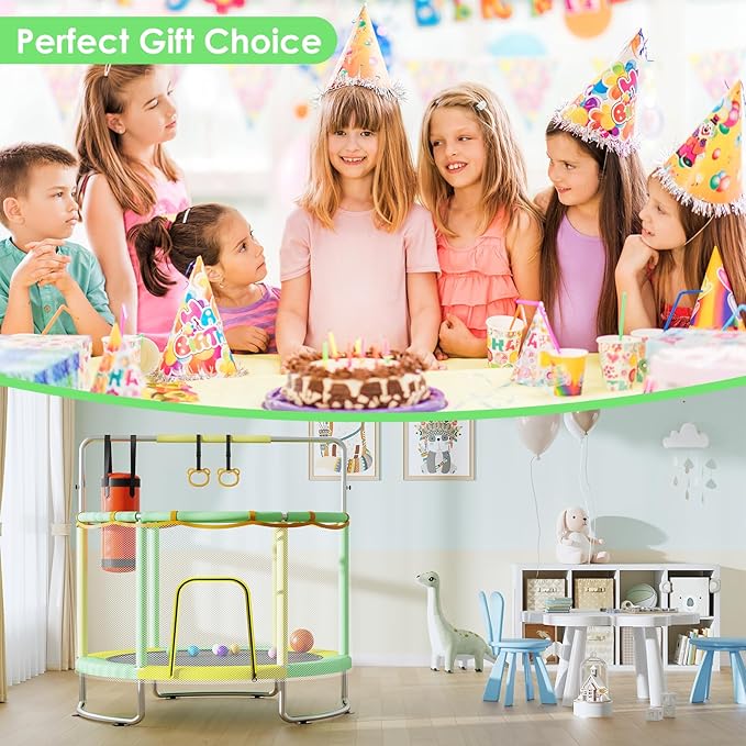 - 【Perfect Gift Choice】With vibrant colors, our trampoline will captivate kids and keep them entertained for hours. It offers a safe, exciting space for jumping and playing, away from furniture, giving you peace of mind. Ideal for birthdays, holidays, or any occasion, this trampoline is the ultimate gift for energetic children. It encourages physical activity and creativity, making it a perfect addition to any home or play area.