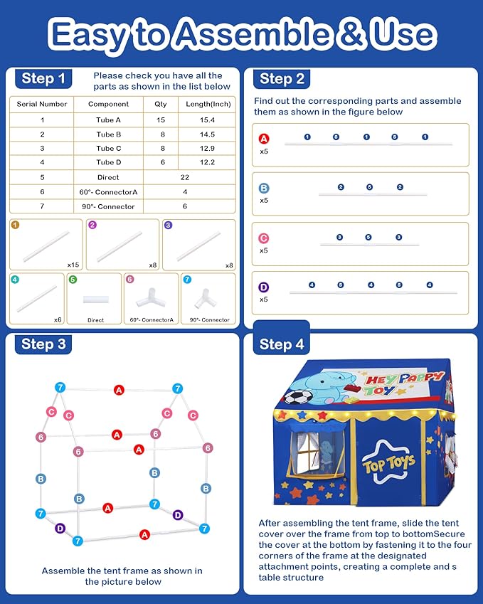- Easy to Assemble: No tools are required, an adult can assemble the indoor tent in 15 minutes, this toddler playhouse come with a detailed step-by-step instructions. Whether indoors, in the backyard, or at the park, assembly is a breeze—just press firmly to secure the poles and ensure a snug fit for the fabric cover. Come and build a small house with your kids today!