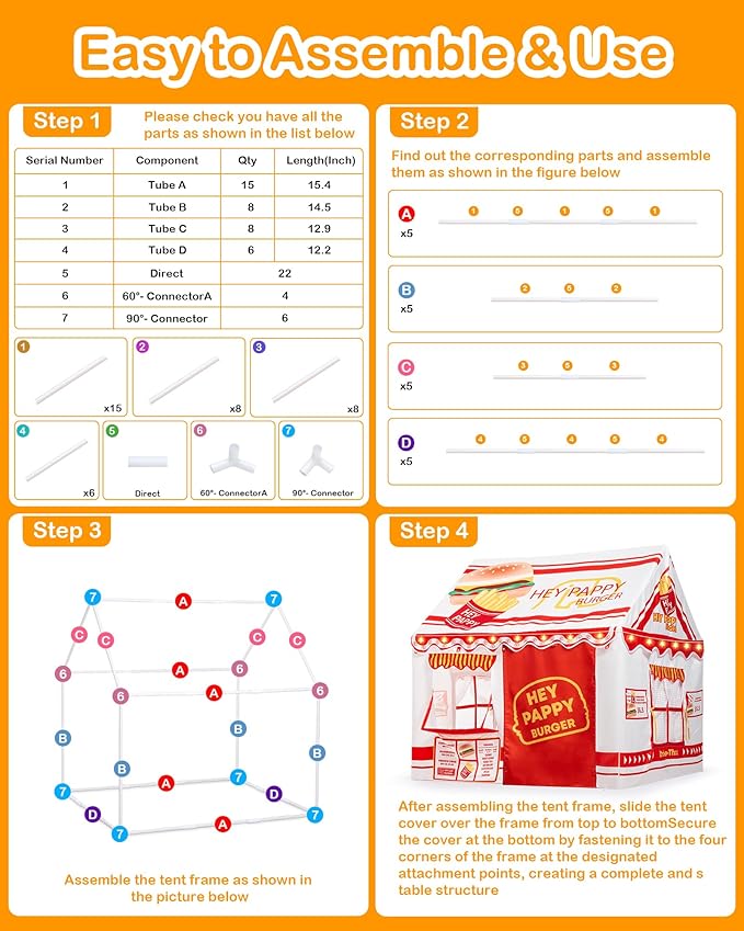 - Easy to Assemble: No tools are required, an adult can assemble the indoor tent in 15 minutes, this toddler playhouse tent come with a detailed step-by-step instructions. Whether indoors, in the backyard, or at the park, assembly is a breeze—just press firmly to secure the poles and ensure a snug fit for the fabric cover. Come and build a small house with your kids today!