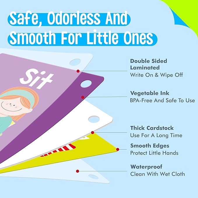 - Well Made: The card adopts sturdy and thickened cardstock with PET film on both sides, durable and tear-resistant. Printed with premium vegetable oil-based ink, BPA-free and safe for kids to use. 2 plastic rings can be used to group, organize, and carry flashcards by category or skill level, keeping everything neat and easily accessible.