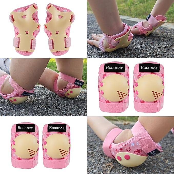 - Ventilated Fabrics - BOSONER kids knee pads and elbow pads set are made of high grade durable fabrics, with EVA foam padding and polycarbonate full-coverage caps, which has good shock absorption and cushioning effect to reduce the damage caused by sports fall