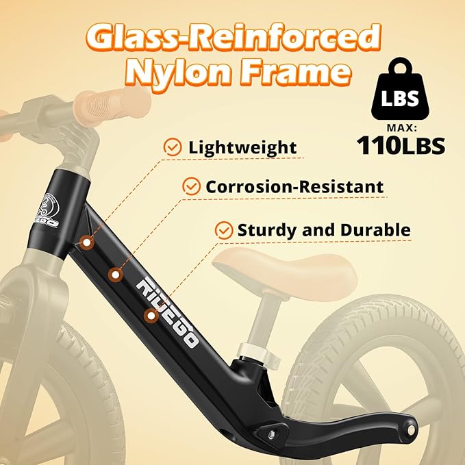- 【LIGHTWEIGHT & DURABLE FRAME 】Built with a glass-reinforced nylon frame, this balance bike offers the same strength as carbon steel with a weight capacity of up to 110 lbs, while weighing only 8.16 lbs. It is also more corrosion-resistant and lightweight. Designed for long-lasting performance, it's easy for kids to handle and parents to carry.
