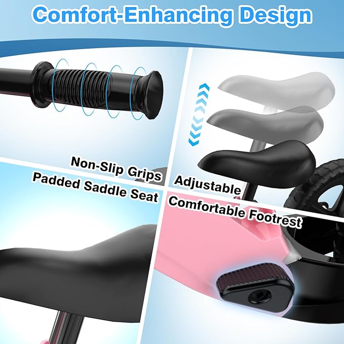 - 【THOUGHTFUL COMFORT DESIGN】 Featuring an adjustable seat height (12.2"–16.9") to grow with your child, a soft padded saddle, a footrest, and non-slip handlebars for enhanced control and comfort. Every detail is crafted to provide a fun and secure ride for balance bike 2+ years old and up.