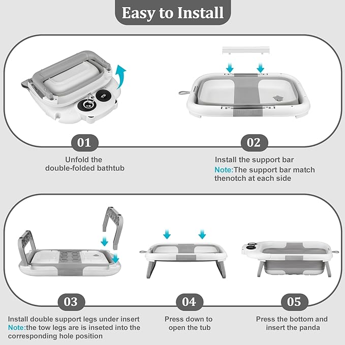 - Double-Fold & Detachable Leg Support: Our collapsible baby bathtub features an ingenious double-fold design, it even folds in half, folding the body into a square with a thickness of 4 inches. Convenient for storage and saving space!