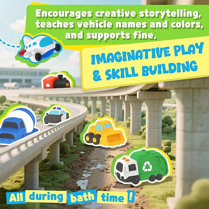 4.Inspire Imaginative Play: Encourage creativity and learning through play! Identify different vehicles, create fun bath games, and develop fine motor skills with vibrant colors and engaging designs.