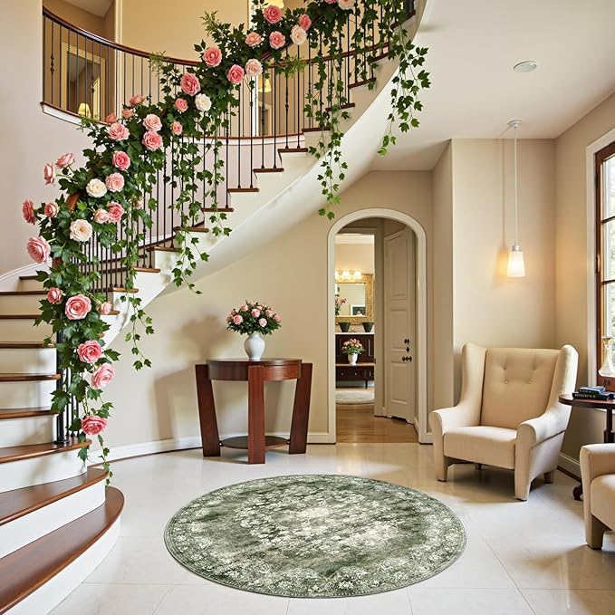 jinchan Round Rug 4ft Area Rug - Green Vintage Floor Mat Kitchen Indoor - Washable Circle 4' Thin Floral Print Carpet Retro Farmhouse Non Slip Dining Room Living Room Bedroom Office