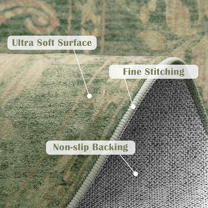 jinchan Round Rug 6ft Area Rugs Vintage Floral Distressed Design,Machine Washable Soft Non-Slip Low-Pile Ultra-Thin Circle Rug for Bedside Living Room Dining Room Bedroom (6' Round, Dark Green)