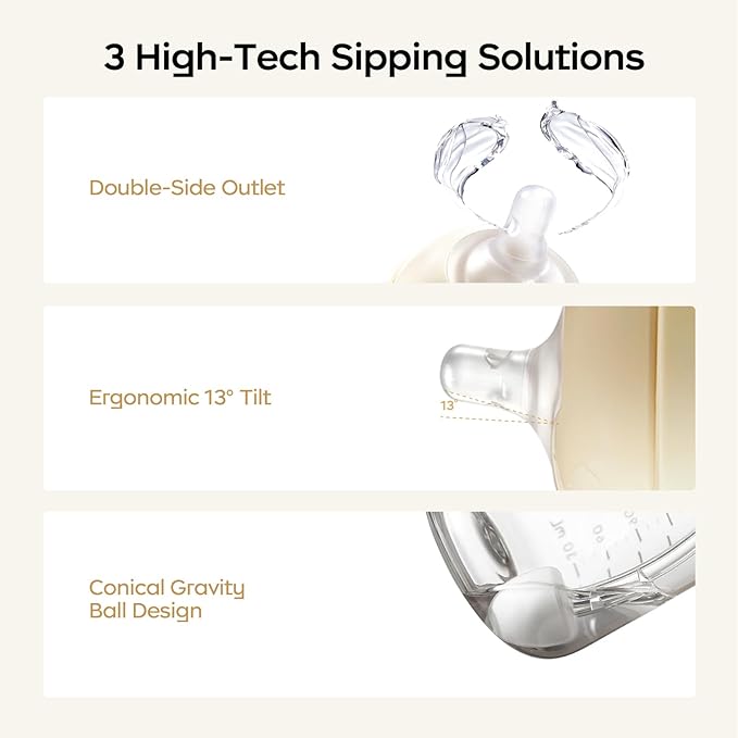 - 【Conical Gravity Ball】Baby milk cup with new conical gravity ball, easier to suck even low water level. sippy cups adopts double sealed valve, no matter how the baby moves will not leak milk