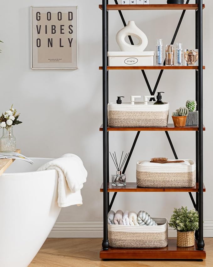 - [ Elegantly Designed to Match Any Décor ] Our small rope basket creates a minimalist appearance, and it adds a touch of warmth and texture to any room. The classic solid color design ensures seamless integration with your existing aesthetics, complementing any decoration. Perfect as decorative storage baskets for shelves, cabinets, and any open display space, making them a stylish and practical addition to any decor, enhancing the overall aesthetics of your room