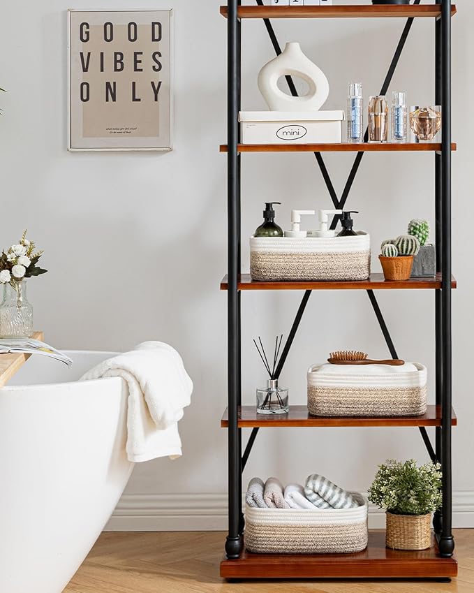 - [ Elegantly Designed to Match Any Décor ] Our small rope basket creates a minimalist appearance, and it adds a touch of warmth and texture to any room. The classic solid color design ensures seamless integration with your existing aesthetics, complementing any decoration. Perfect as decorative storage baskets for shelves, cabinets, and any open display space, making them a stylish and practical addition to any decor, enhancing the overall aesthetics of your room