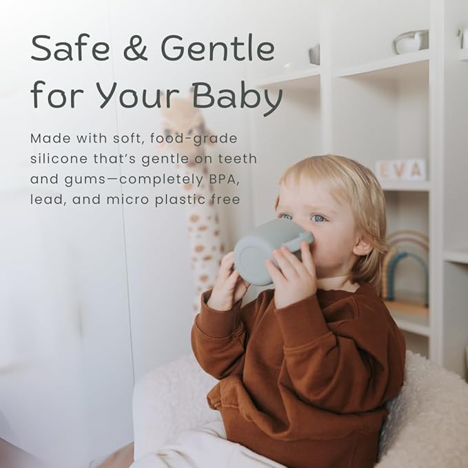 - SPOUT LID: The free-flowing soft spout lid on our silicone cups allows for easy suction for your baby and toddler. The silicone material is also gentle on your child's teeth and gums.