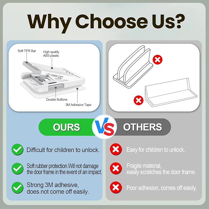 - Newly Upgraded sliding door lock for child safety: Unlike other sliding door stopper on the market that children can easily unlock, our child proof sliding glass door lock requires two-handed operation (pressing buttons on both sides and pressing the cover plate), making it much harder for children to open. This upgraded sliding door child proof lock provides families with more reliable protection.
