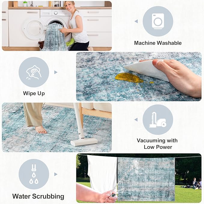 - Machine Washable Area Rug: Say goodbye to hidden dirt and cleaning hassles. The 0.2" low pile soft rug keeps most dirt on the surface, Easy to clean with a low-power vacuum cleaner.They are machine washable, and for sizes 6x9 and larger, we recommend using a commercial washing machine to restore their original beauty