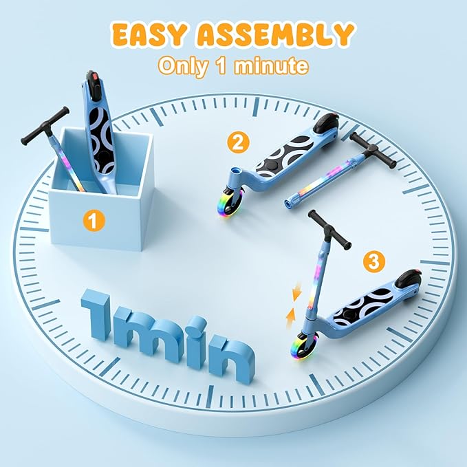 - High Quality Tire Design: Kids electric scooter is equipped with flashing wheels and headlights, which emit colorful light during riding; the dual-function design of the rear wheels as both fenders and foot brakes facilitates quick deceleration, and easy stopping or slowing down when needed, which makes it safer for kids to play.