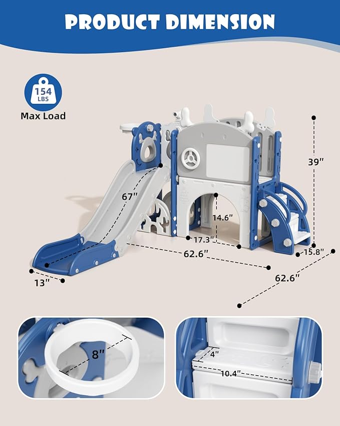 - Multifunctional Playground: Designed with a gentle slope and an enclosed easy-to-climb staircase with handrails, this slide aids in improving children's hand-eye coordination and balance. The telescope satisfies your kid's interest and curiosity in observing the world, and the basketball hoop adds more fun for your little athlete. (A small ball is included.)