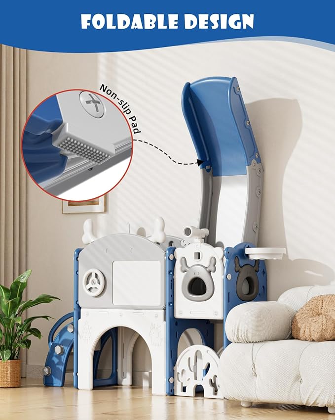- 12-in-1 Toddler Playset: This playset includes a slide, a climber, a telescope, a drawing board, a crawl-through tunnel, a basketball hoop and a ball, elk antlers, a corridor, a steering wheel, hide-and-seek windows, and a storage space. Besides, it includes a newly launched golf set that is not available on other slides on the market, which enables you and your kids to play golf through this playset.