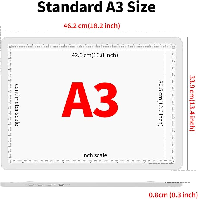 - 【 Standard A3 size, CM-INCH double scale 】 This super bright lightpad Overall Size is 46.2 x33.9 x 0.8 cm ( 18.2 x 13.4 x 0.3 inches ), and the visual working area is 42.6 x 30.5 cm ( 16.8 x 12.0 inches ). Illuminated area large enough for international standard A3 paper. This Light Drawing Sketch Pad has a dual scale of centimeters and inches to meet your various usage habits.