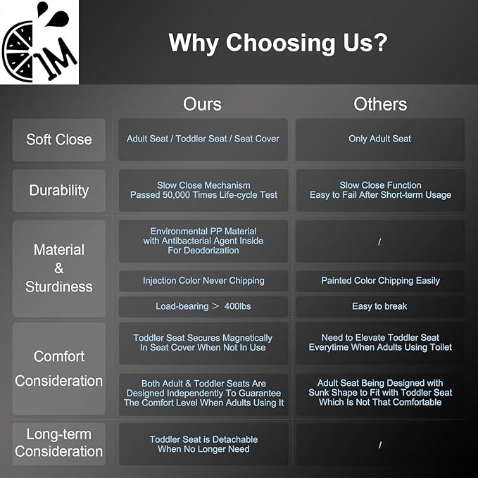 - NONO MORE SLAMMING - Both the Adult and Toddler Seats, as well as the Seat Cover contained with our unique Silence-Closing Technology, no worry about pinched fingers or scaring the kids. MORE SLAMMING - Both the Adult and Toddler Seats, as well as the Seat Cover contained with our unique Silence-Closing Technology, no worry about pinched fingers or scaring the kids.