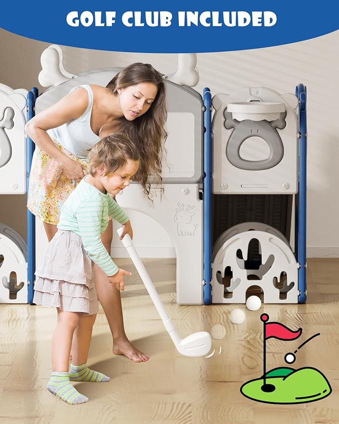 - 13-in-1 Toddler Playground: Toddler slide with 13 activity areas, New Play Golf Set, also includes slide, golf clubs and balls, drawing board, platform, Steering Wheel, Crawl-through Tunnel, corridor, basketball hoop, Elk Antlers, binoculars and 2 storage spaces for toys!
