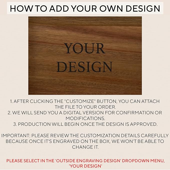 - Your Design Option: If none of our designs match your request, feel free to upload your own in PNG or JPG format. We will send you a digital version for confirmation or modifications. Production will begin once the design is approved.