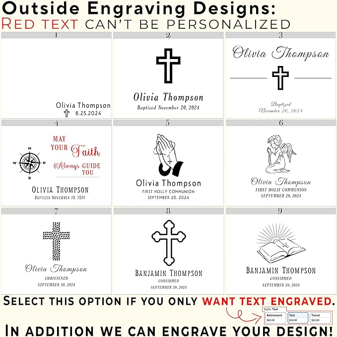- Customizable: Personalize your baptism memory box with various designs we offered including name and date. Each design can be changed to "Baptized", "Christened," "Confirmed," "First Communion," etc. or removed entirely if indicated. We’ll use the font style showcased in the photos. The inside lid can also be engraved with your text(different font options). Create a unique and meaningful gift!