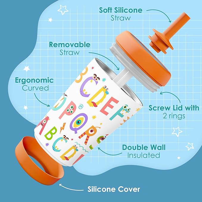 Kid Insulated Stainless Steel Tumbler with Silicone Straw, 12oz Sippy Cup for Kids (Alphabet)