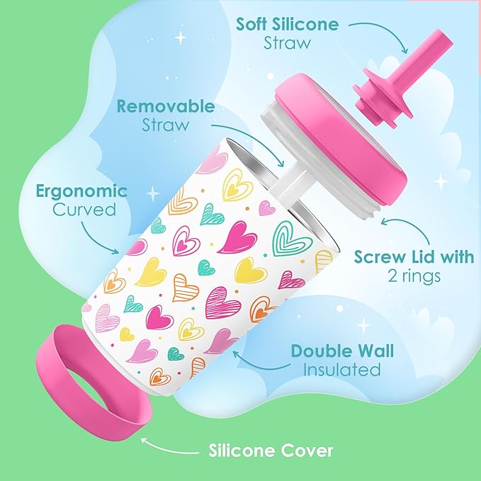 Kid Insulated Stainless Steel Tumbler with Silicone Straw, 12oz Sippy Cup for Kids (Playful Hearts)