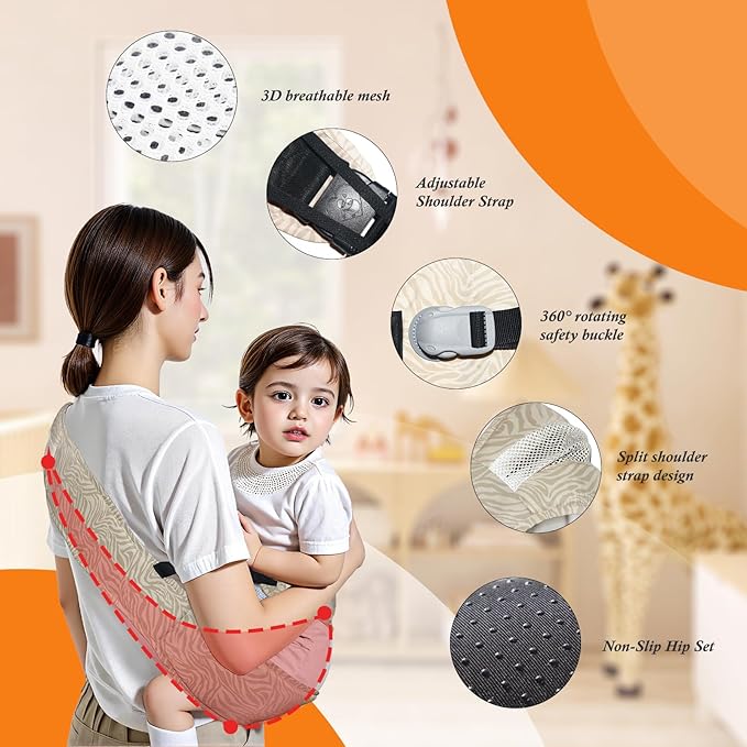 - 360°Safety and Double Protection:Equipped with a 6cm mountaineering-grade 360° rotating safety buckle and made of 600D high-density Oxford cloth, this baby carrier sling is slip-resistant and extra durable. The 10cm anti-slip safety rope provides additional protection, ensuring your child’s safety, making it an ideal toddler hip carrier for both everyday and outdoor use.