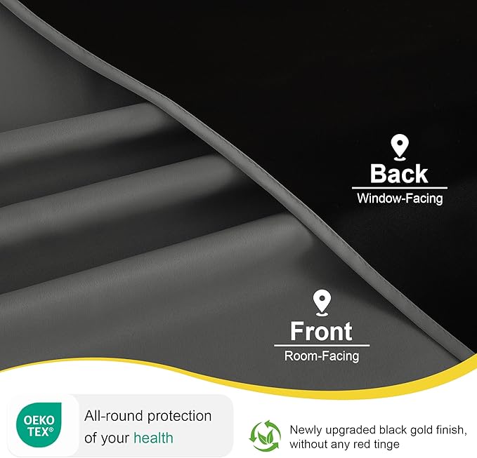 - 100% BLACKOUT: These curtains are manufactured in a STANDARD 100 certified by the OEKO TEX factory. The curtains can block out 100% bright sunlight and UV ray, bring you a full room darkening environment for good night sleep, afternoon nap and weekend lie-ins.
