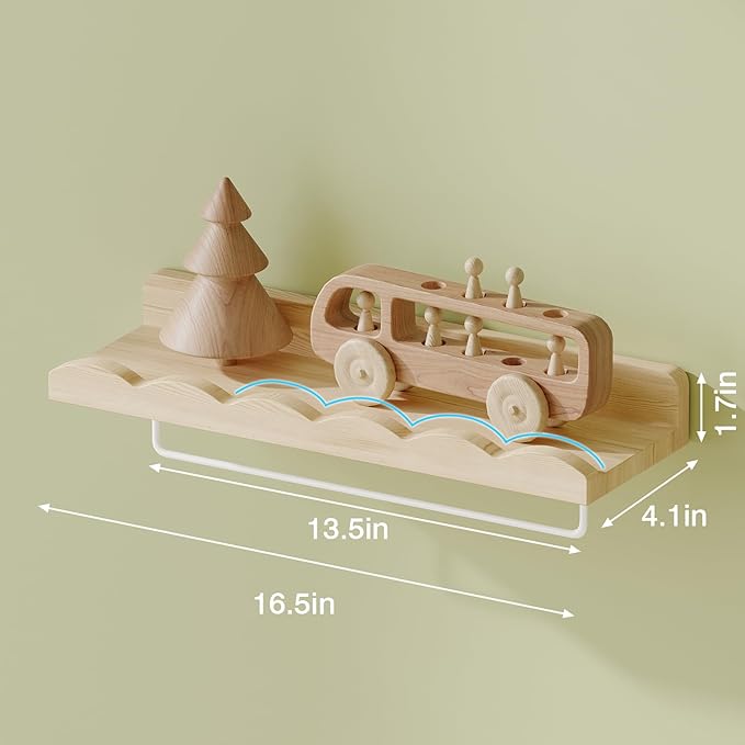 - 【Natural Wood & Anti-Crash Design】Our nursery shelves are Made of long-lasting solid pine wood, these floating book shelves are built to last and provide a reliable storage solution for your children's favorite items. With smooth edges and anti-crash design, this bookshelf not only organizes your child's books and toys but also adds a touch of safty and creativity to their space.