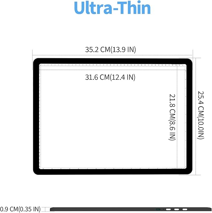 - [Dual Measurement System & Spacious A4 Workspace]: CM/INCH dual scales adapt to global crafting standards. The size of tracing light box is 13.9 x 10.0 in (35.2 x25.4 cm). Generous 12.5 x 8.6 in (31.6x21.8cm) illuminated area fits A4 paper, diamond painting kits, and tattoo stencils. Ultra-slim 0.35 in (0.9 cm) profile slips into portfolios. Note: Surface is scratch-resistant but avoid sharp tools