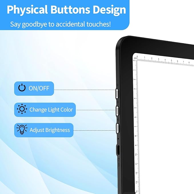 - [Dual Measurement System & Spacious A3 Workspace]: CM/INCH dual scales adapt to global crafting standards.The size of tracing light box is 18.2 x 13.4 in (46.2 x 33.9 cm). Generous 16.8 x 12 in (42.6 x 30.5 cm) illuminated area fits A3 paper, diamond painting kits, and tattoo stencils. Ultra-slim 0.3 in (0.8 cm) profile slips into portfolios. Note: Surface is scratch-resistant but avoid sharp tools