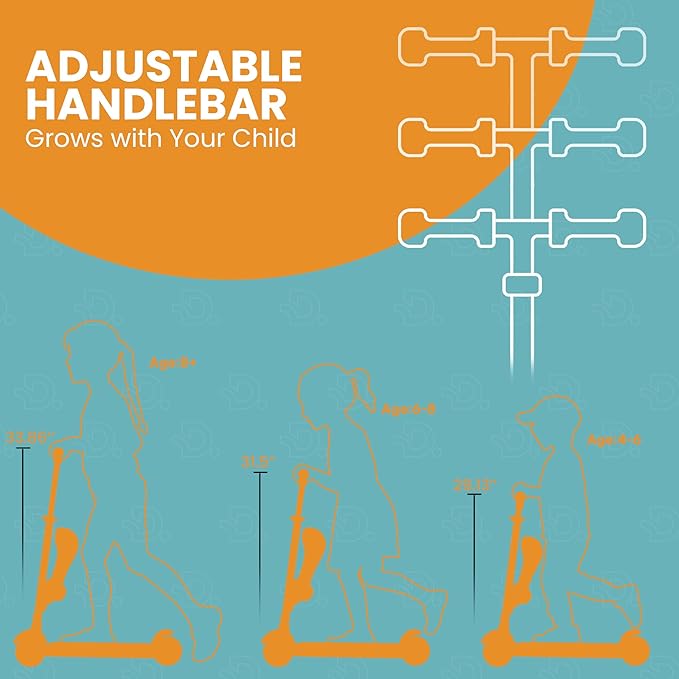 - Grows with Your Child – The adjustable T-bar handlebar offers four height settings (26.77’’, 29.13’’, 31.5’’, and 33.86’’ inches), making this kids 3 wheel scooter the perfect ride for toddlers as young as 2 years old weighing up to 165 lbs.