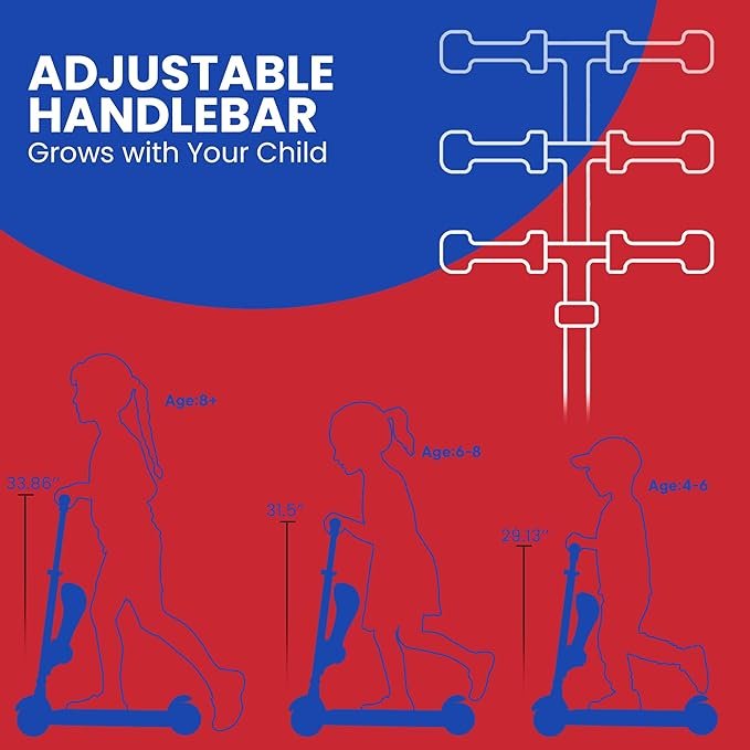 - Grows with Your Child – The adjustable T-bar handlebar offers four height settings (26.77’’, 29.13’’, 31.5’’, and 33.86’’ inches), making this kids 3 wheel scooter the perfect ride for toddlers as young as 2 years old weighing up to 165 lbs.