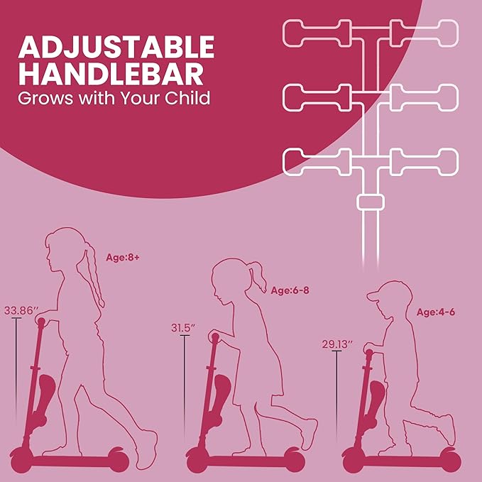 - Grows with Your Child – The adjustable T-bar handlebar offers four height settings (26.77’’, 29.13’’, 31.5’’, and 33.86’’ inches), making this kids 3 wheel scooter the perfect ride for toddlers as young as 2 years old weighing up to 165 lbs.