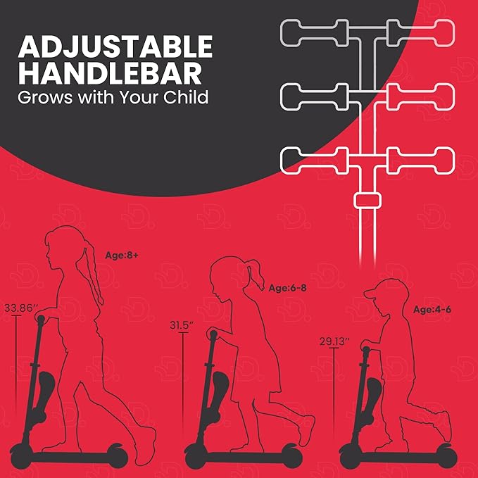 - Grows with Your Child – The adjustable T-bar handlebar offers four height settings (26.77’’, 29.13’’, 31.5’’, and 33.86’’ inches), making this kids 3 wheel scooter the perfect ride for toddlers as young as 2 years old weighing up to 165 lbs.
