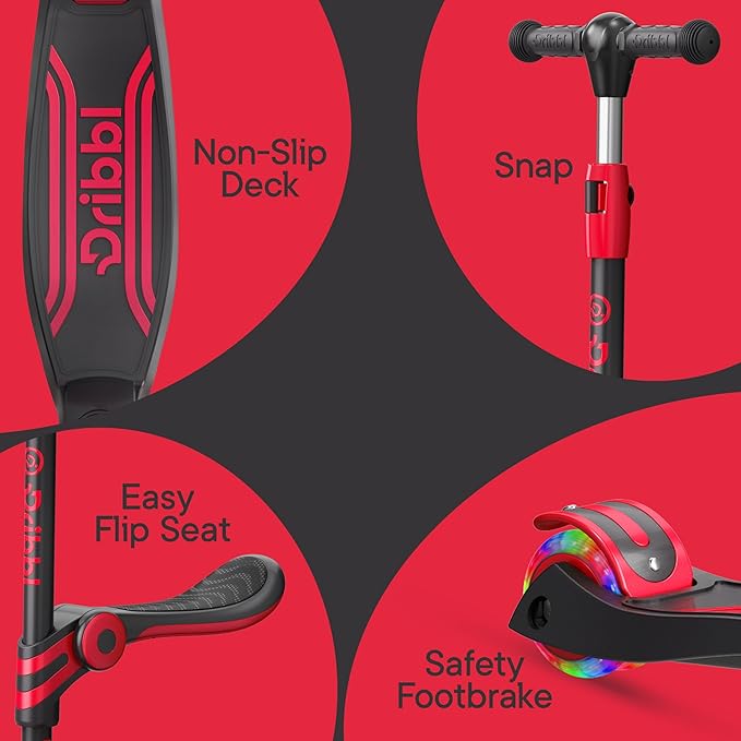 Black and Red 3 Wheel Scooter with Seat for Kids – Light-Up LED Wheels, Adjustable Handlebar and Seat, Smooth PU Wheels, Wide Anti-Slip Deck, Rear Foot Brake – Toddler Outdoor Toys for Ages 2+