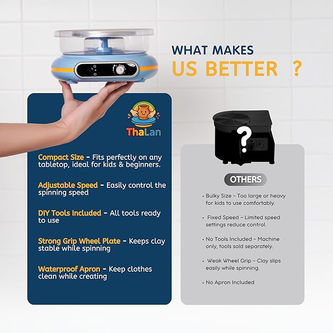 - ADJUSTABLE SPEED MOTOR WITH LOW NOISE OPERATION : Designed with adjustable speed settings, the ThaLan kids pottery wheel kit ensures smooth, quiet operation, allowing your child to focus on their creations without distraction. The precision control turntable spins evenly for trimming, shaping, and sculpting with professional results.