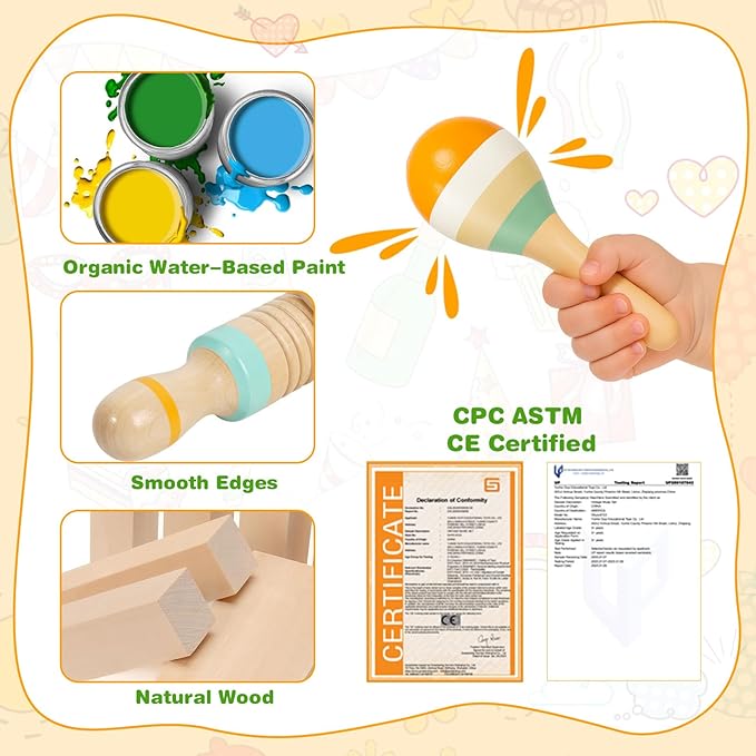 - š± Child-Safe Montessori Toys for Toddlers 1-3- Our baby musical instruments are made from natural wood & non-toxic water-based paints. The montessori instruments for toddlers are CPC/ASTM certified. The montessori baby toys come with Smooth edges, no splinters, and baby-safe construction ensure worry-free play. Ideal toddler musical instruments for 1 2 3 Year Old, BPA-free and easy to clean.