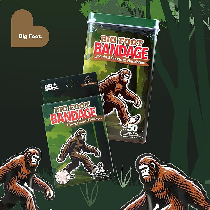 - BIGFOOT BANDAGES: This 50 piece tin of Sasquatch shaped bandages is great for putting a smile on kids' faces while protecting wounds such as cuts, scrapes, and burns; sticky bandages come in a cute tin and are perfect for kids and adults alike, and also for school nurses and pediatric doctors