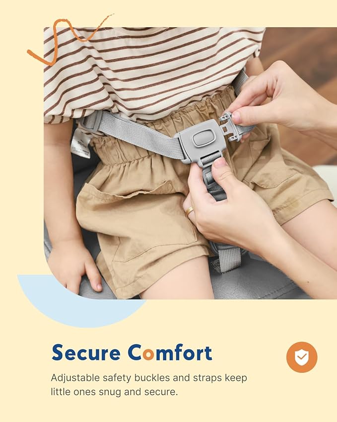 - Secure & Stable: 3-point adjustable harness with front buckle and non-slip base ensures secure fit on booster seat for kitchen chair. Support kids for worry-free mealtimes